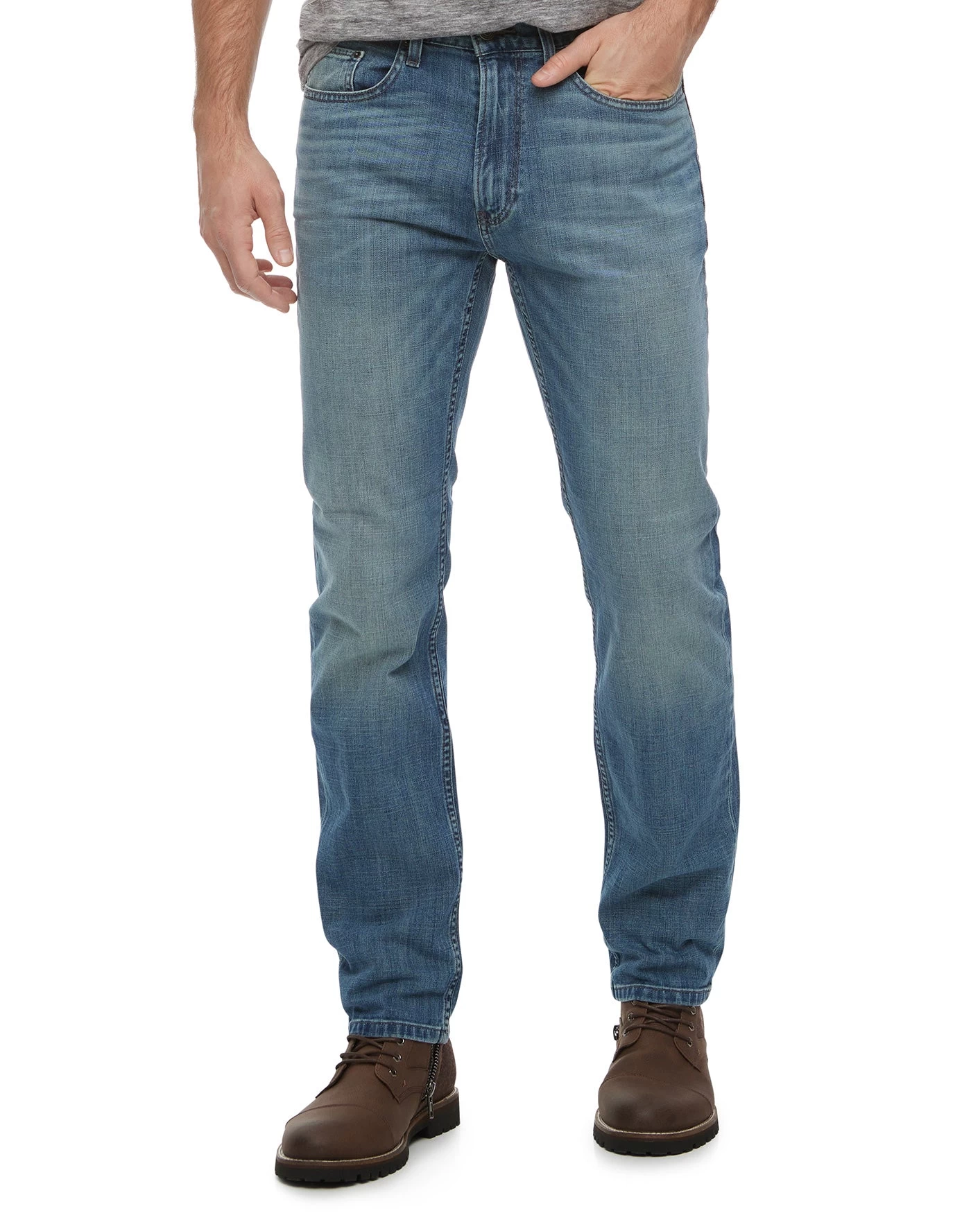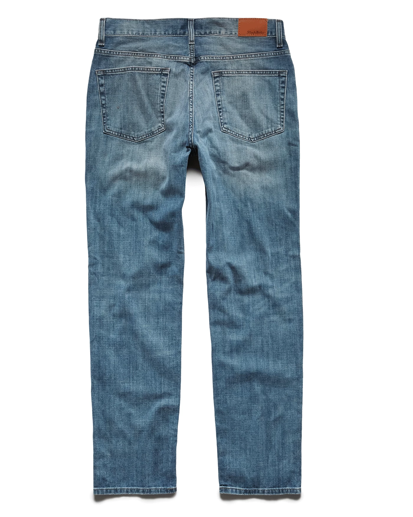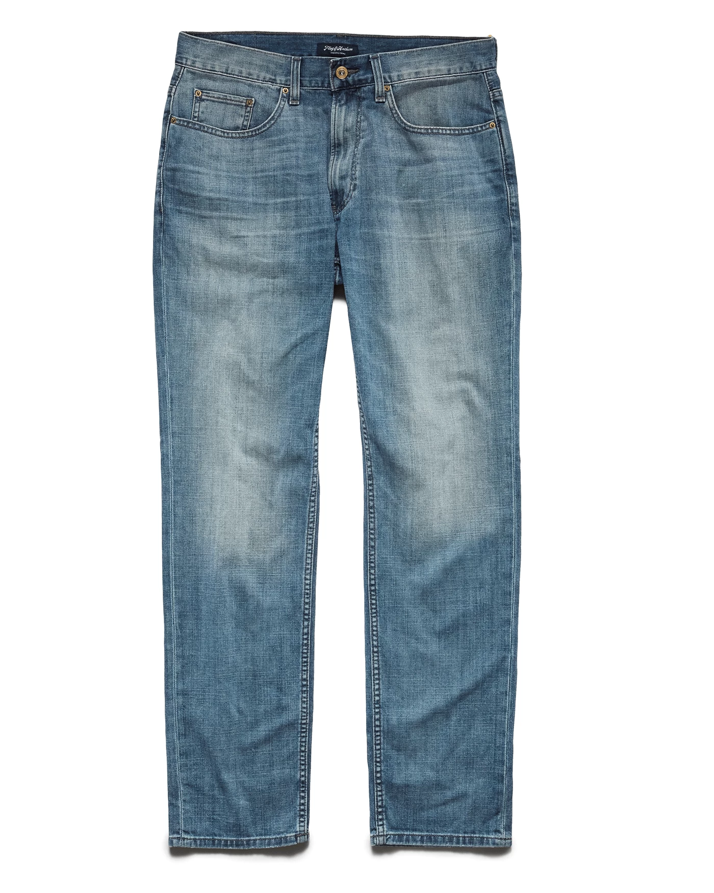 All-day comfort comes easy in our premium stretch denim jeans. Ideal for everyday casual wear, our athletic-fit Adrian Jean is perfect for the guy who needs a little extra room in the thigh and features our roomiest fit through the seat and thigh and a slight taper below the knee, traditional 5-pocket styling, and a hint of spandex for a more flexible fit. Regular rise; zip-fly front with logo button closure. Leather logo back patch. Light wash.