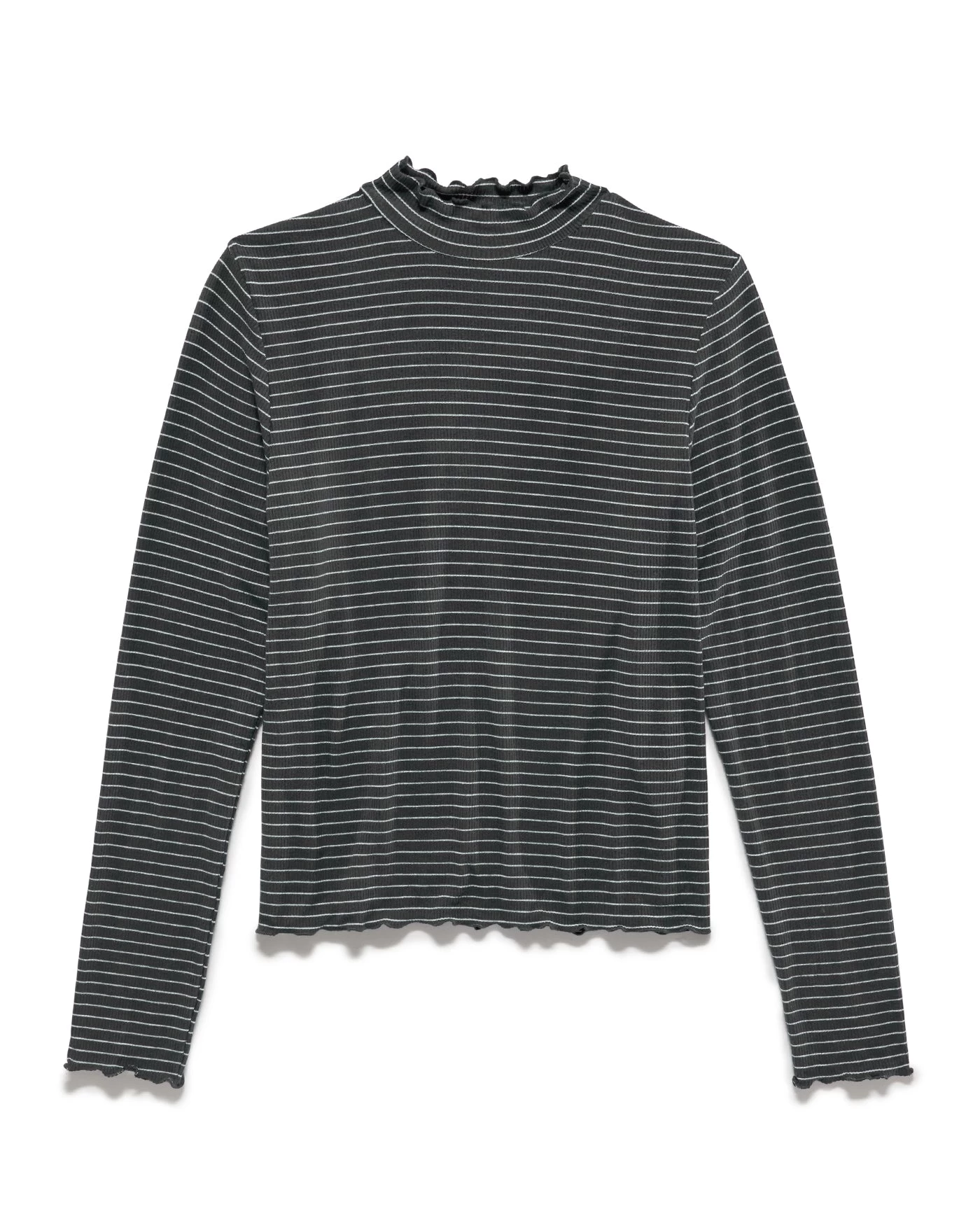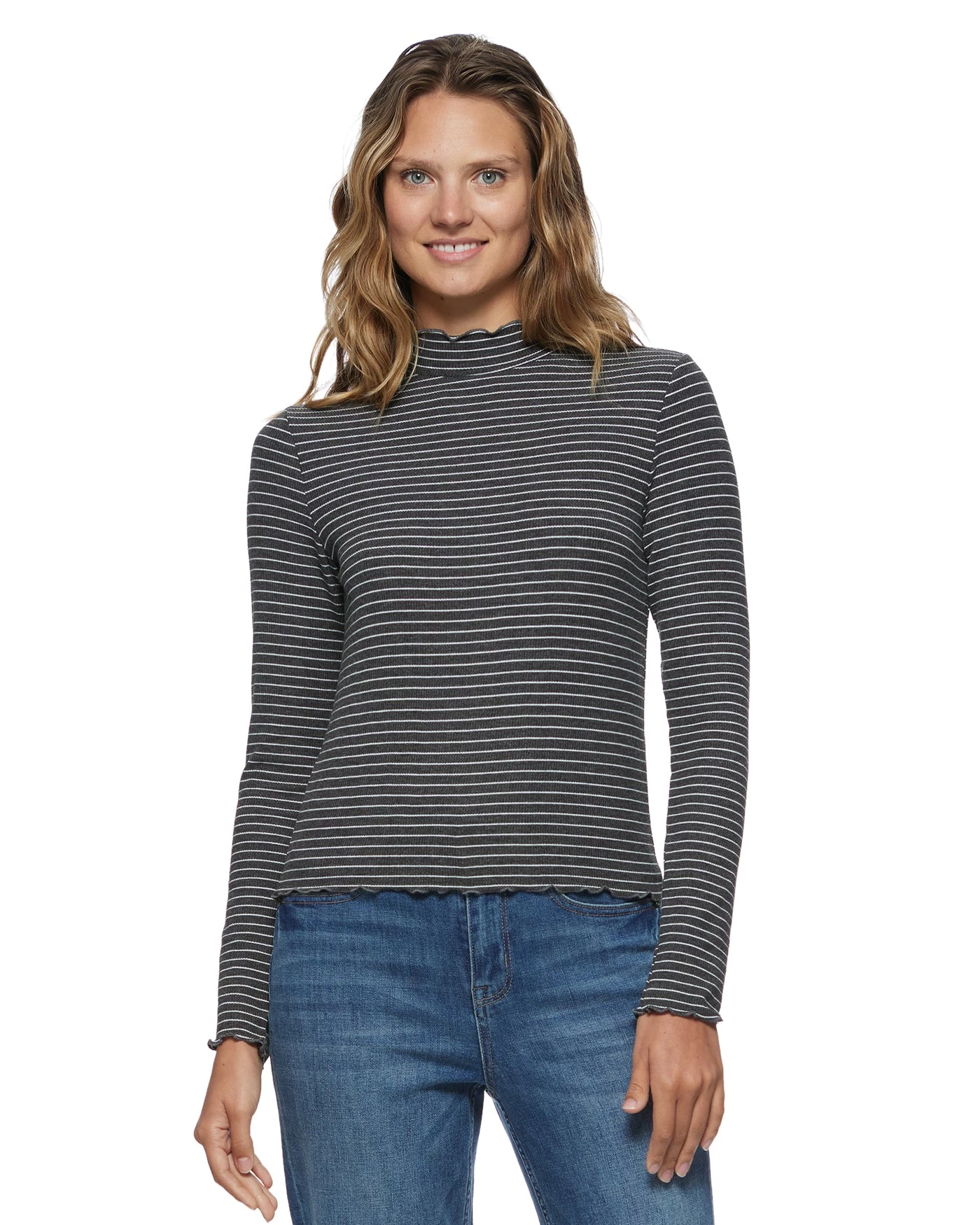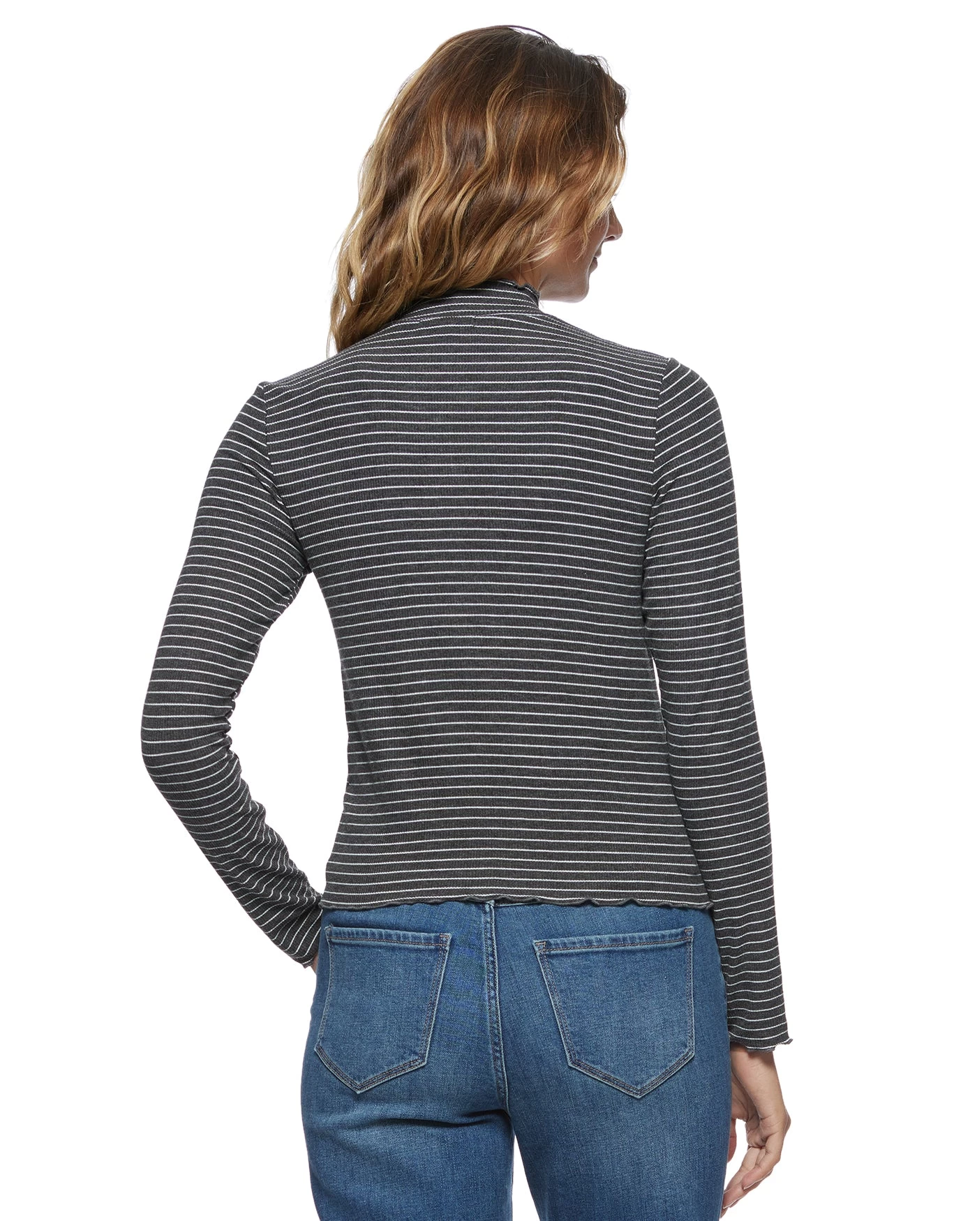 Flaunt your style smarts with our Aleene Ribbed Lettuce-Edge Top. This must-have stretchy, ribbed knit top features a classic striped print across its mock neckline and long sleeves. The perfectly fitted bodice falls at the waist and pairs perfectly with your favorite denim for a casually cute autumn-ready look. Lettuce edge trim throughout adds a perfect finish that’s totally on-trend.