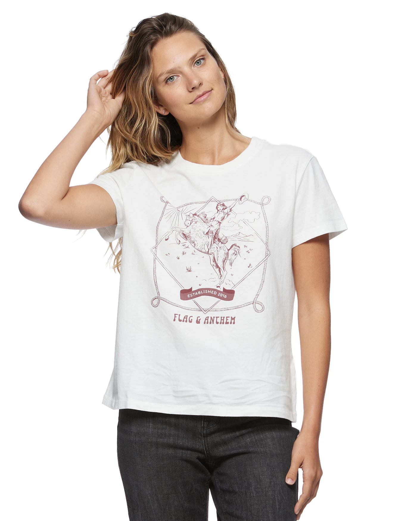 Take your weekend wardrobe to the next level with our Cowgirl Cropped Graphic Tee. This trendy, relaxed tee has a 100% premium cotton composition that shapes a classic crew neckline, short sleeves, and a cropped bodice that boasts all-original Flag & Anthem graphic artwork.