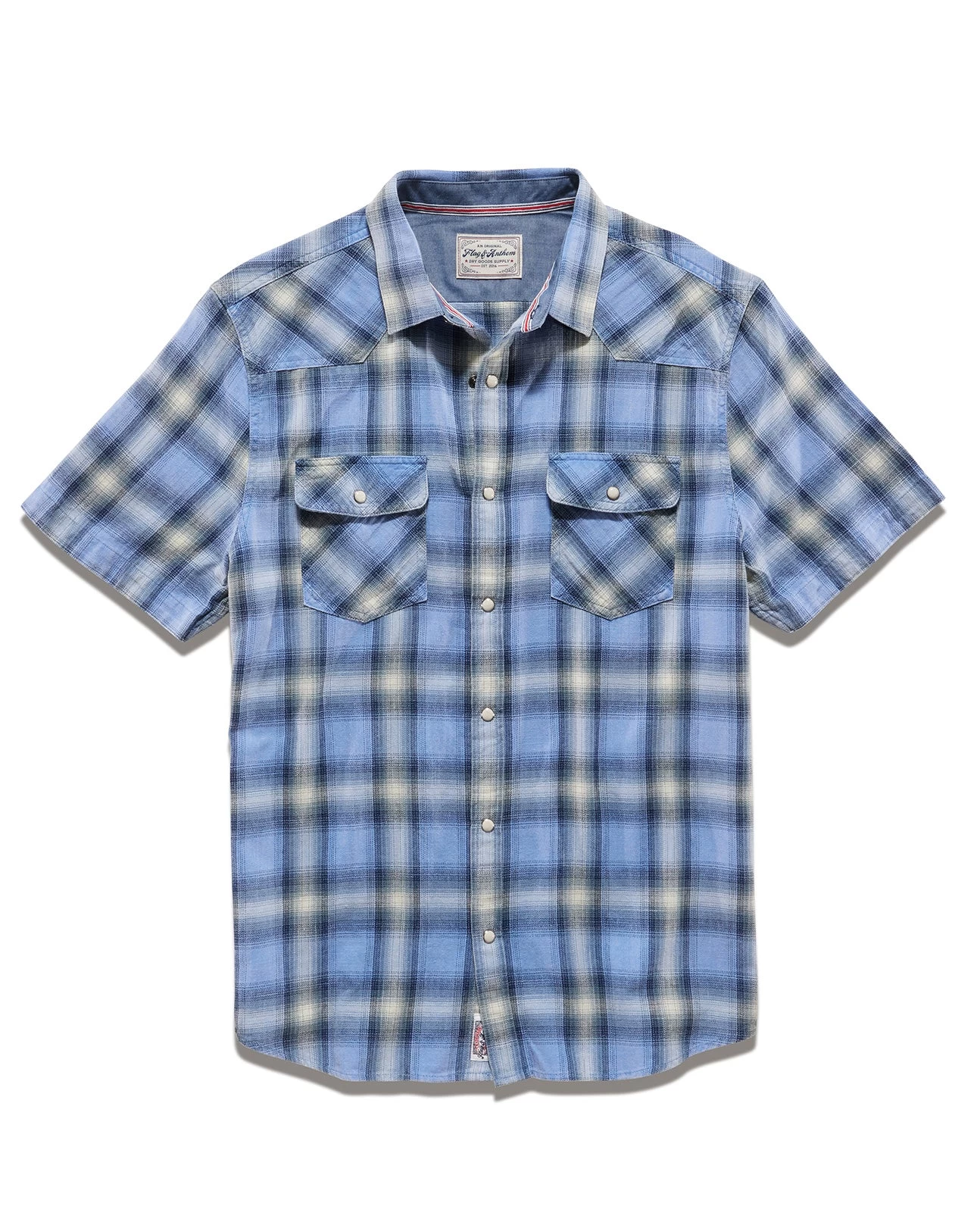 Made from breathable, lightweight cotton that’s been washed for supreme softness and featuring versatile vintage-inspired details to elevate your look instantly, this premium plaid shirt provides ultimate comfort in warmer weather and is a staple for your everyday rotation. Contrast chambray fabric in collar and cuffs. Dual front flap pockets; pearlized snap closures. Tailored athletic fit.