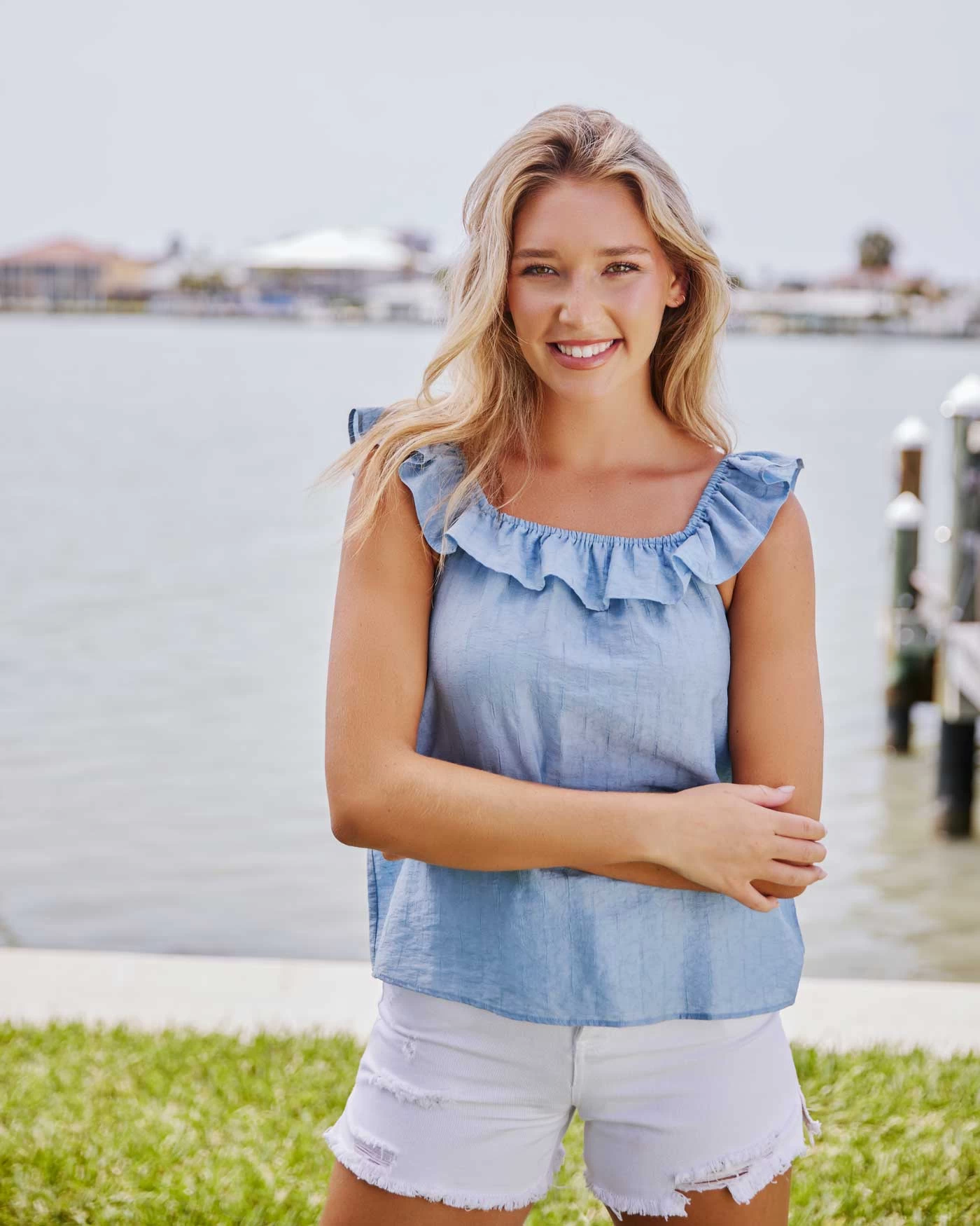 As feminine and flirty as it is casual and classic, our Ellisville Ruffle Neck Sleeveless Chambray Top is a must-have for warmer weather, so make sure to get it before it’s gone! Woven linen blend chambray fabric is perfectly lightweight as it shapes a figure-flattering shift silhouette that falls from elastic straps to form a straight neck adorned with ruffles.
