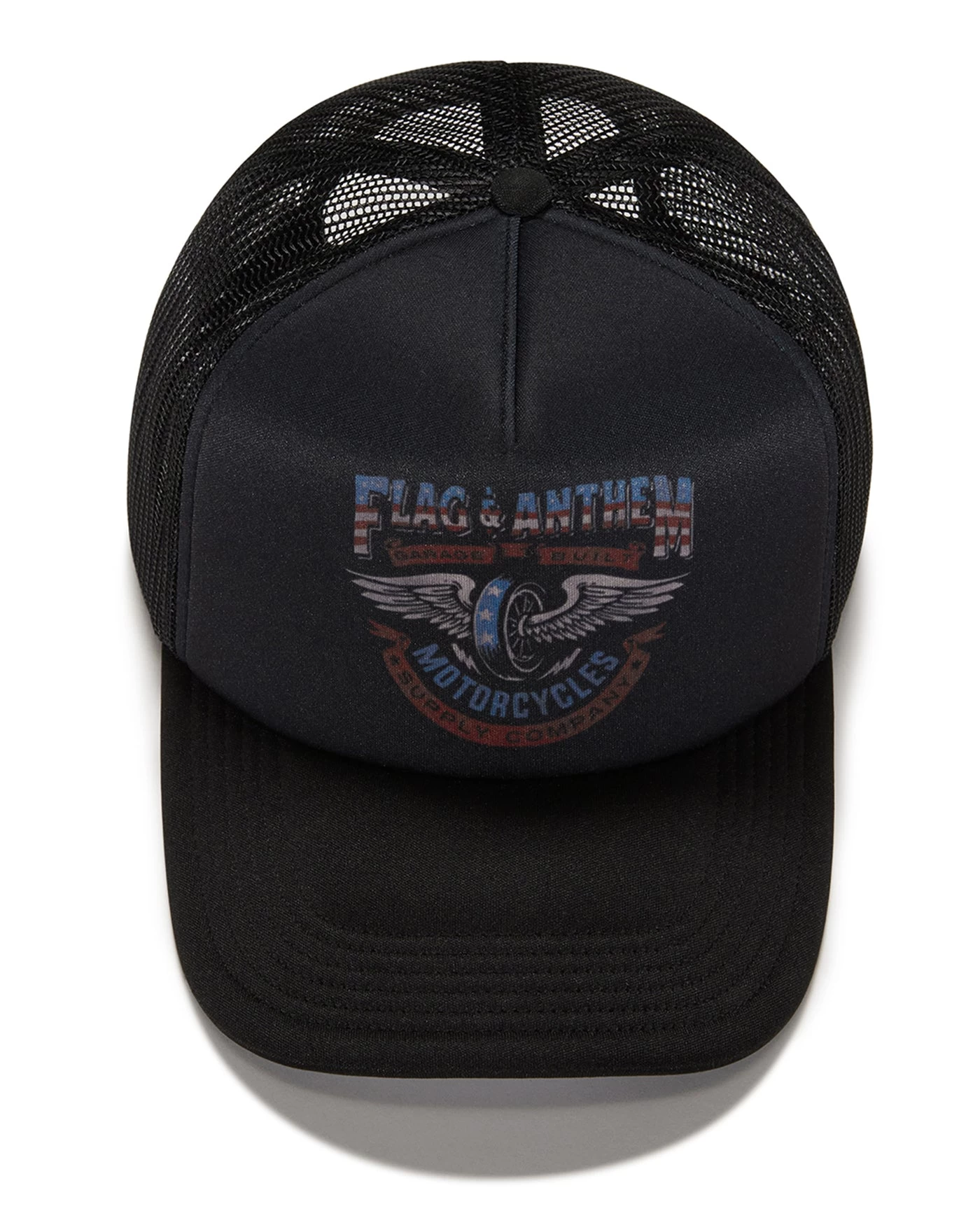 Hit the open road in style with our vintage-inspired Garage Motorcycle Foam Trucker Hat that features all-original Flag & Anthem artwork in classic Americana colors. Mesh side back panels deliver increased airflow and added ventilation. Pre-curved brim; adjustable snapback closure.