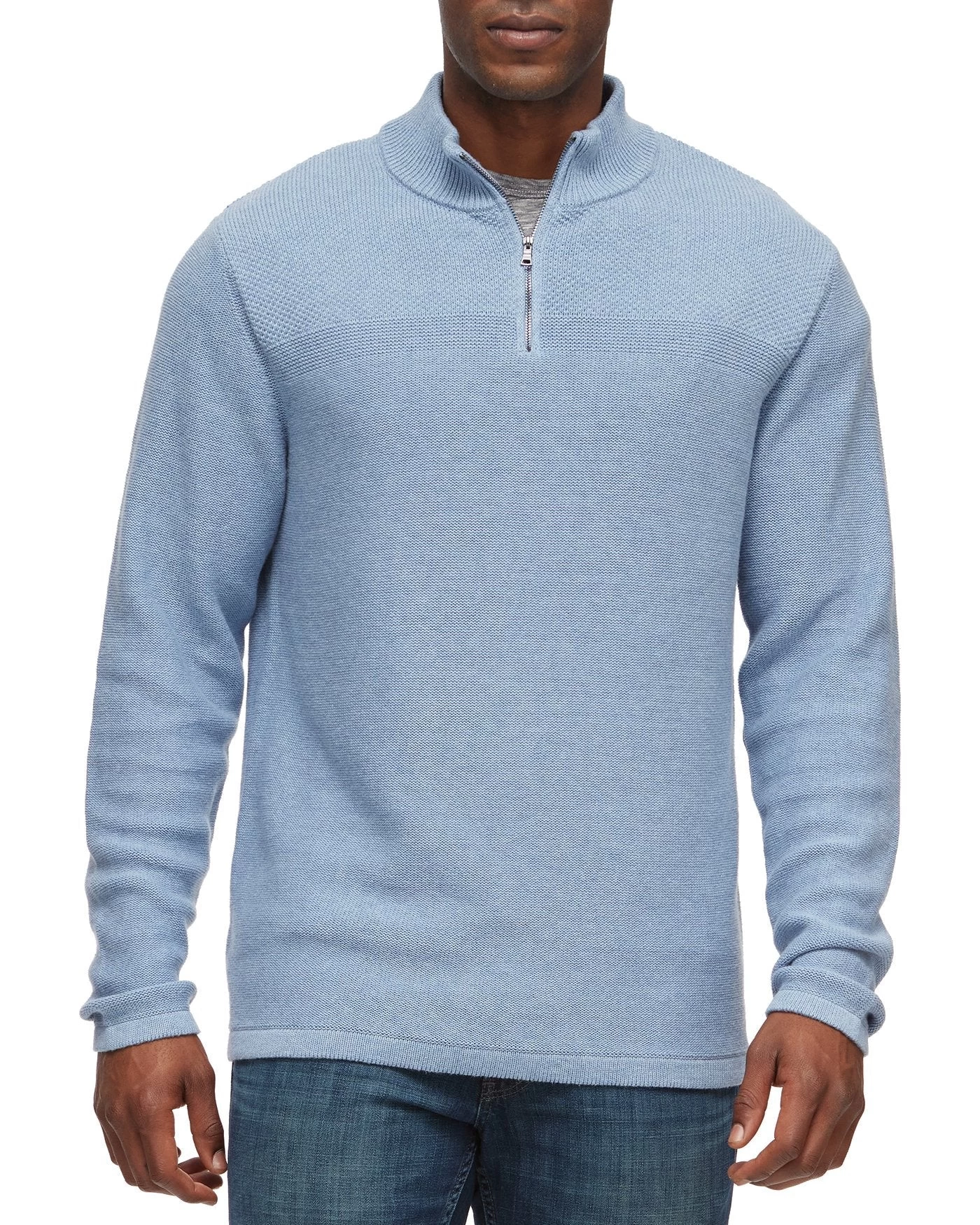 Layer on the comfort, style, and warmth in this casual yet polished pullover sweater featuring a 1/4-zip mock neck collar and an all-over distinctive textured stitch. Mixed stitching along collar, armholes, and chest; pineapple stitched top yoke at shoulders. Tailored athletic fit.