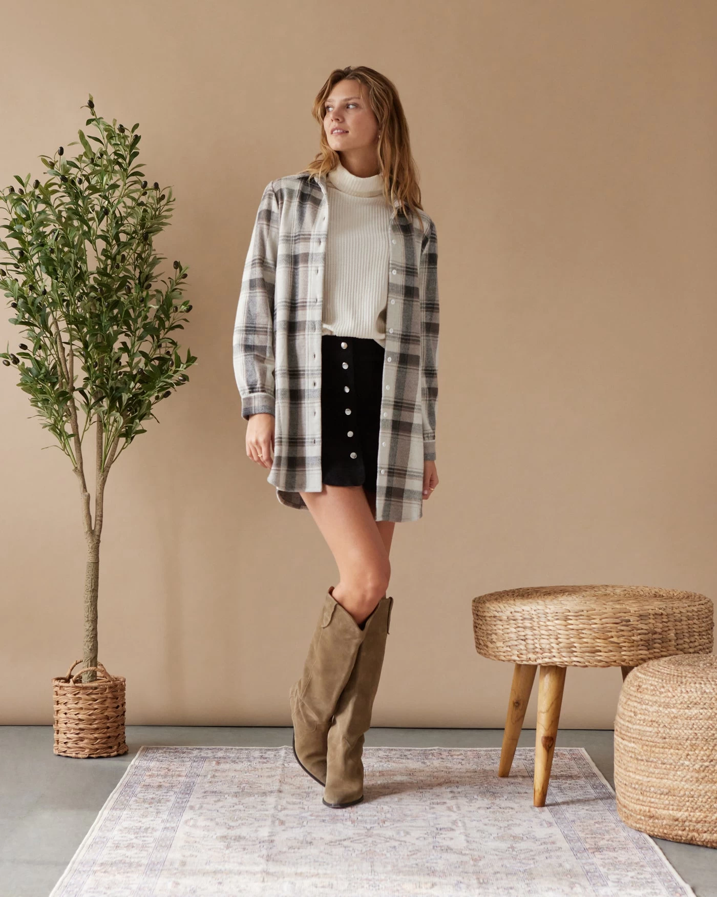From pumpkin patches and apple picking to hayrides and haunted houses, all your favorite fall activities just got a little more stylish thanks to our Hero Plaid Knit Button-Front Mini Dress. This autumn-ready shift dress is composed of lightweight stretch woven fabric (with a timeless plaid print) that shapes a collared neckline and long sleeves with button cuffs. The relaxed, oversized bodice features a functional button placket that continues down to the flirty mini hem.