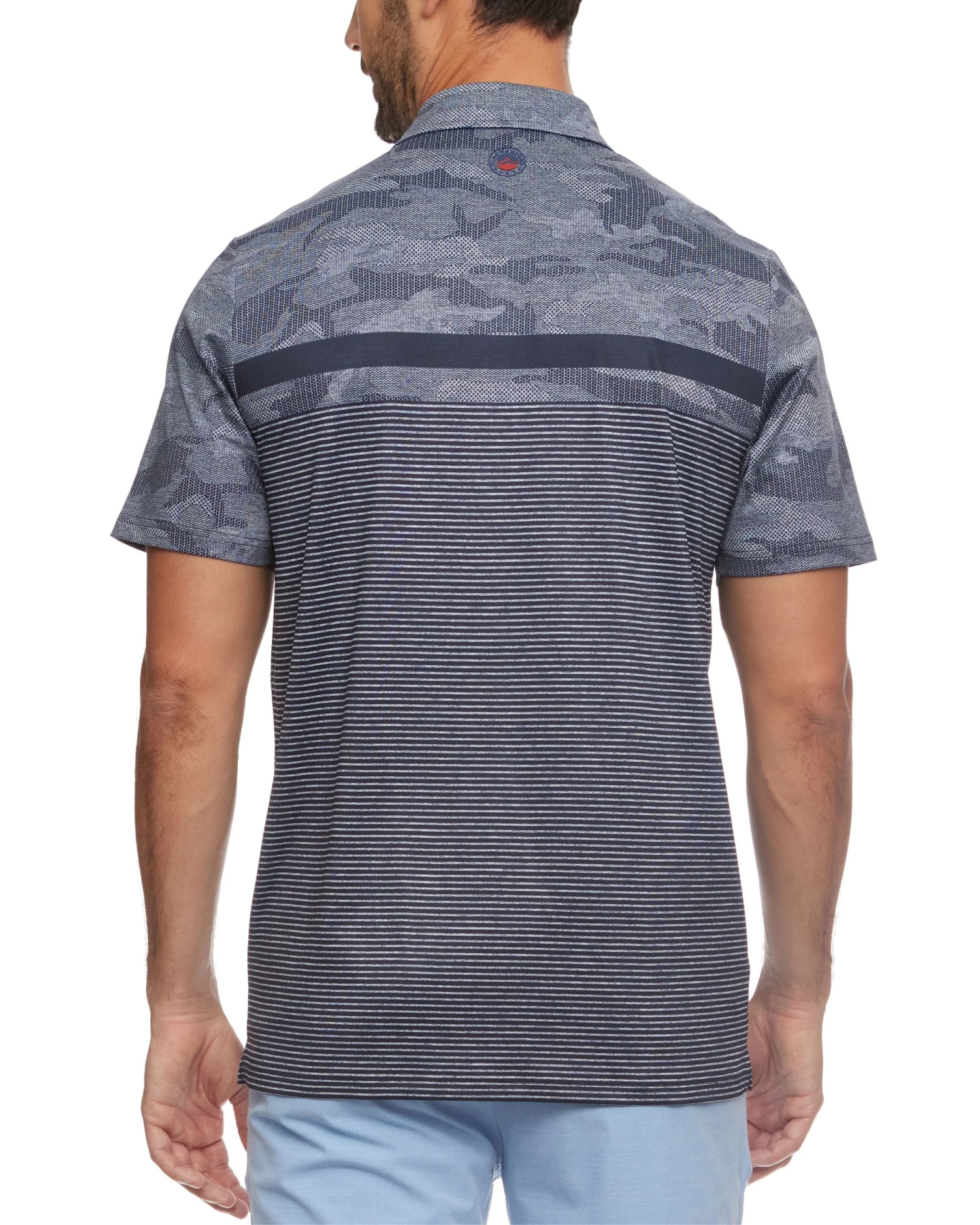 Made for the links. Ready for anything. This stripe & camo print polo packs all the performance punch of your favorite golf polo into a versatile style that you can wear anywhere. Made from a lightweight and breathable jersey fabric that delivers moisture-wicking technology, UPF sun protection, and easy care benefits plus four-way stretch for optimal mobility during your next round. Traditional three-button front placket; rubberized MadeFlex performance patch logo at center back neck. Tailored athletic fit.