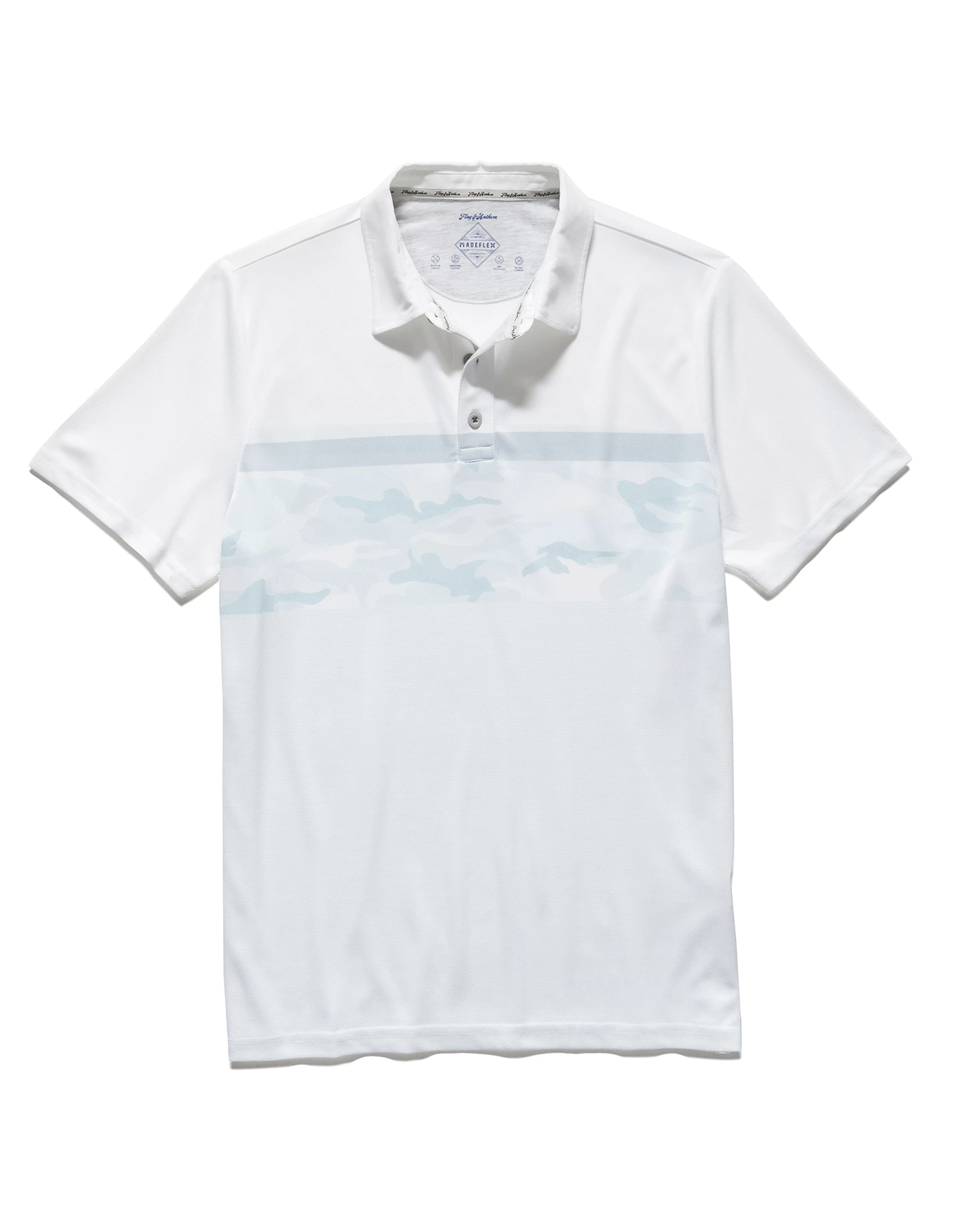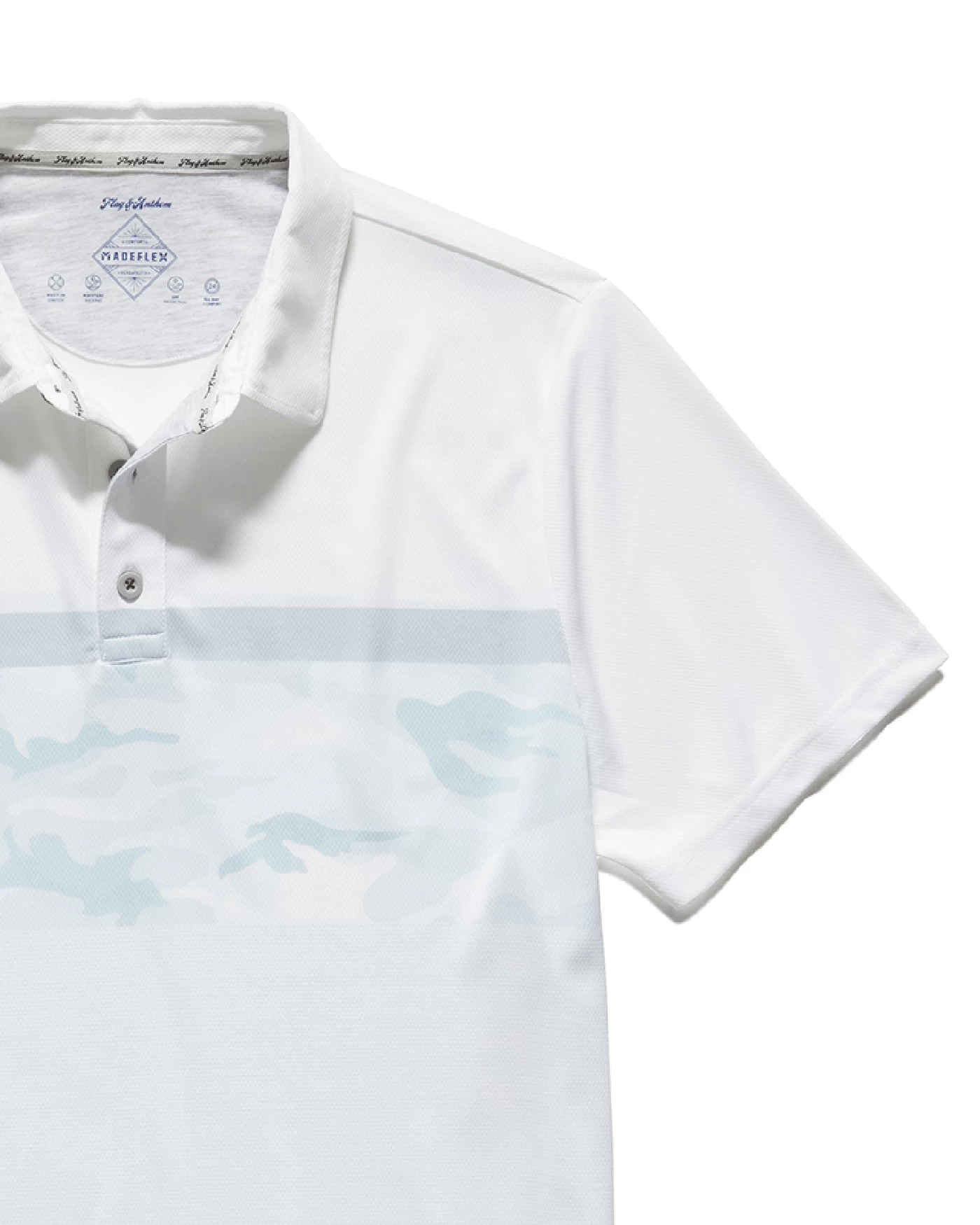 Made for the links. Ready for anything. This camo print polo packs all the performance punch for your favorite golf polo into a versatile style that you can wear anywhere. Made from a lightweight and breathable jersey fabric that delivers moisture-wicking technology, UPF sun protection, and easy care benefits plus four-way stretch for optimal mobility during your next round. Traditional three-button front placket; rubberized MadeFlex performance patch logo at center back neck. Tailored athletic fit.