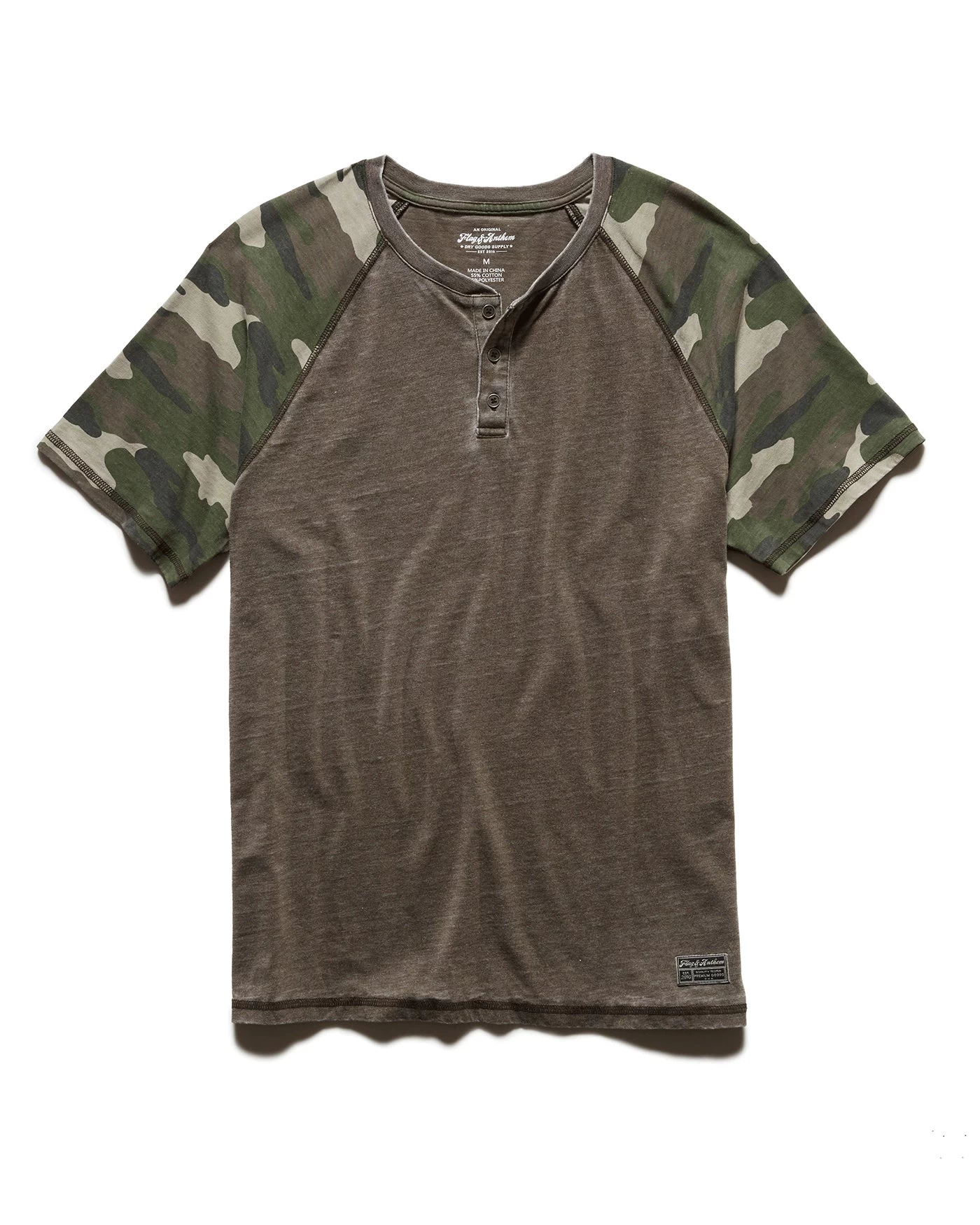A bit more buttoned-up than your standard tee but equally as comfortable, our Laneburg Burnout Henley is the perfect addition to your everyday laidback look. Camo raglan sleeves; 3-button front placket. Tailored athletic fit.