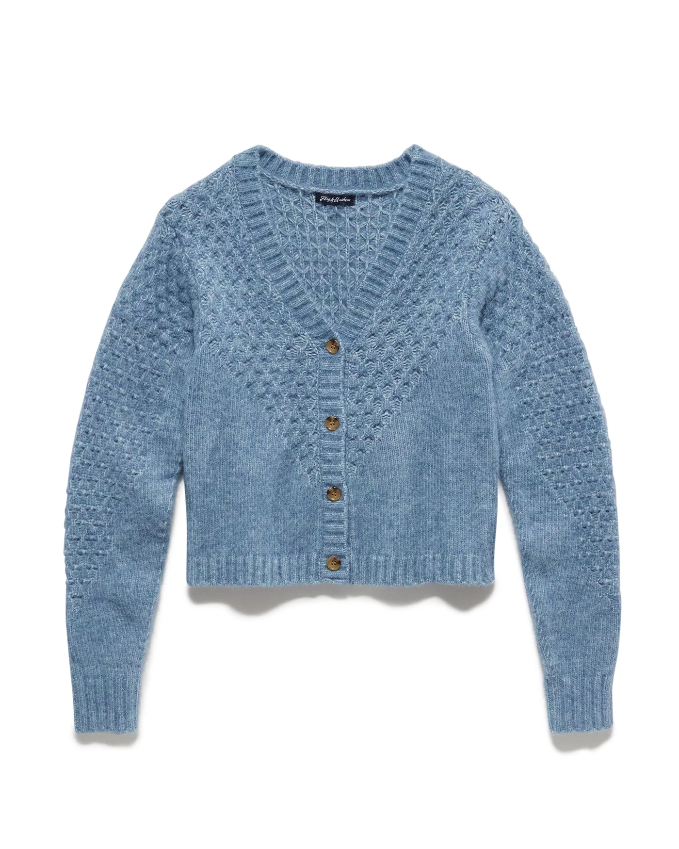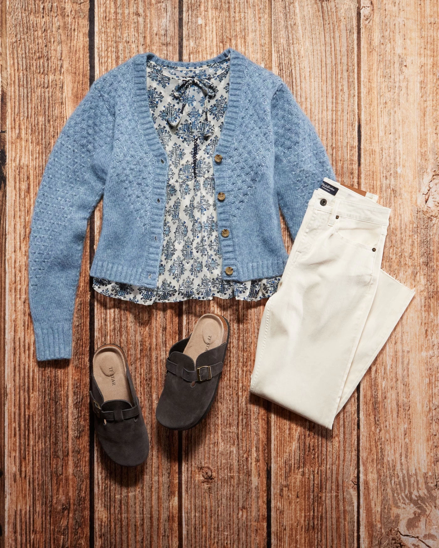Layer up for chilly days and nights with our Lottie Cropped Cardigan! Cozy, chunky, wool blend knit shapes this classic cardi that features a V-neckline and long sleeves with drop shoulders. Brown marbled buttons accent the relaxed silhouette before ending at a slightly cropped hem. Pair with high-rise jeans and booties for a classic fall ‘fit.