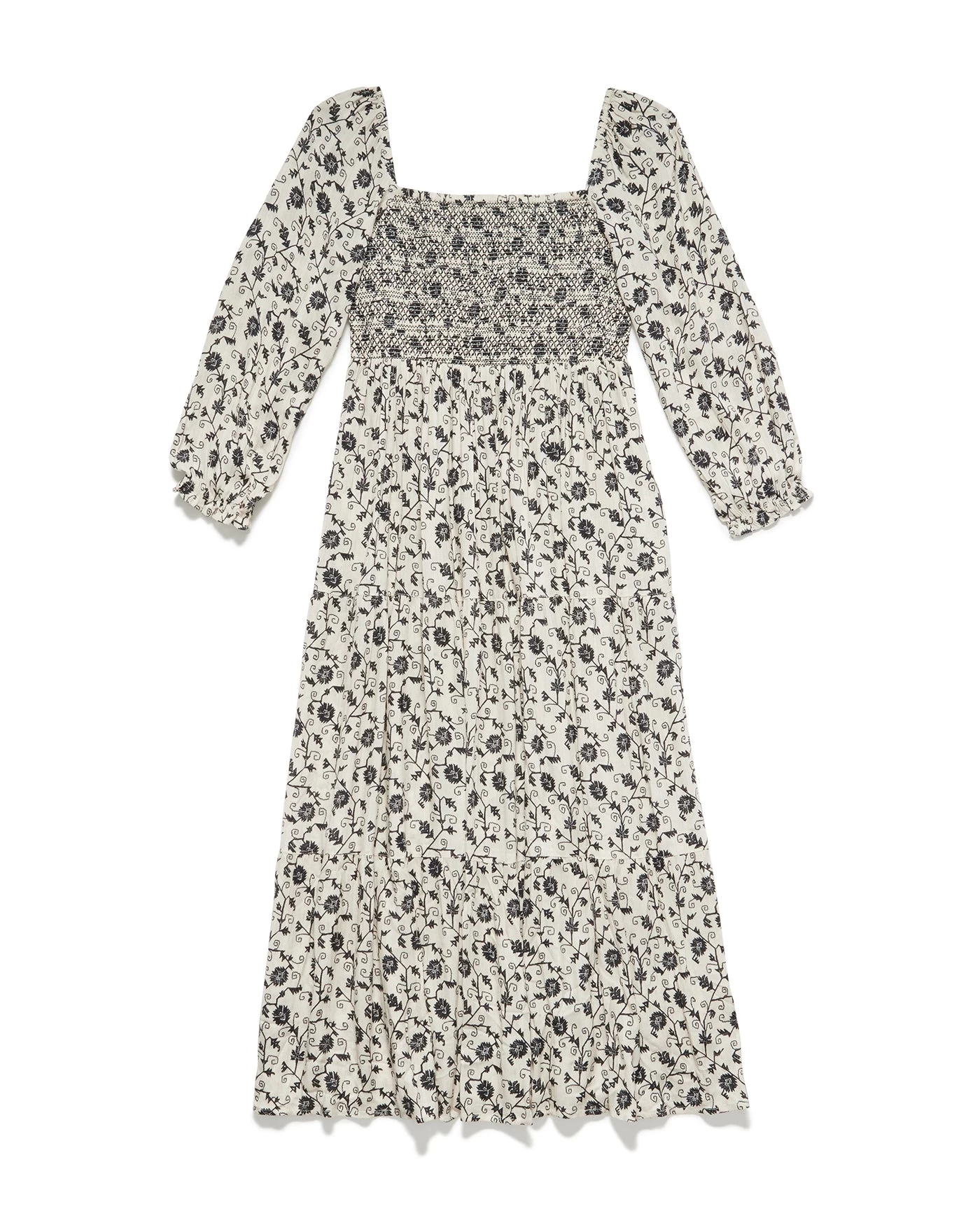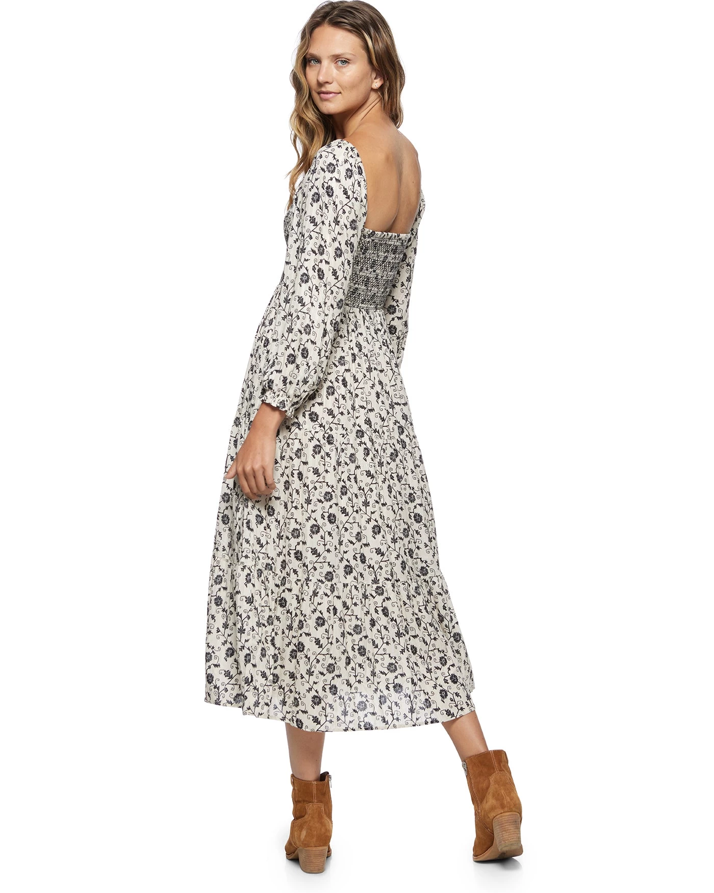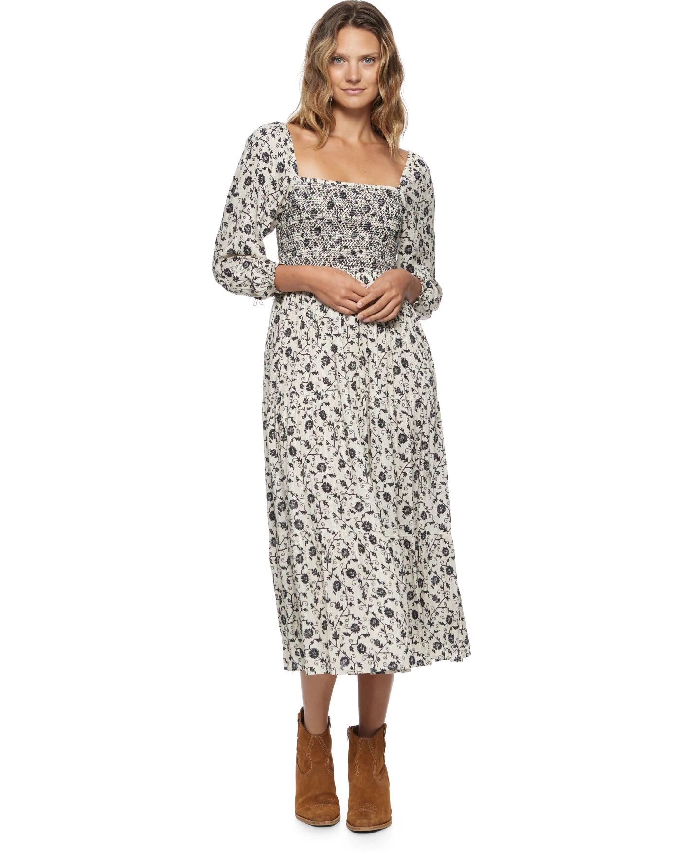 You’ll bring an unforgettable presence everywhere you go wearing our Nora Floral Print Smocked Midi Dress. Lightweight woven fabric, decorated with vintage-inspired florals, shapes this fabulous fall dress that starts with short puff sleeves that frame a square neckline and a smocked bodice. The high-fitted waist falls down to a tiered, figure-skimming silhouette before ending at a midi hem. Functional on-seam pockets.