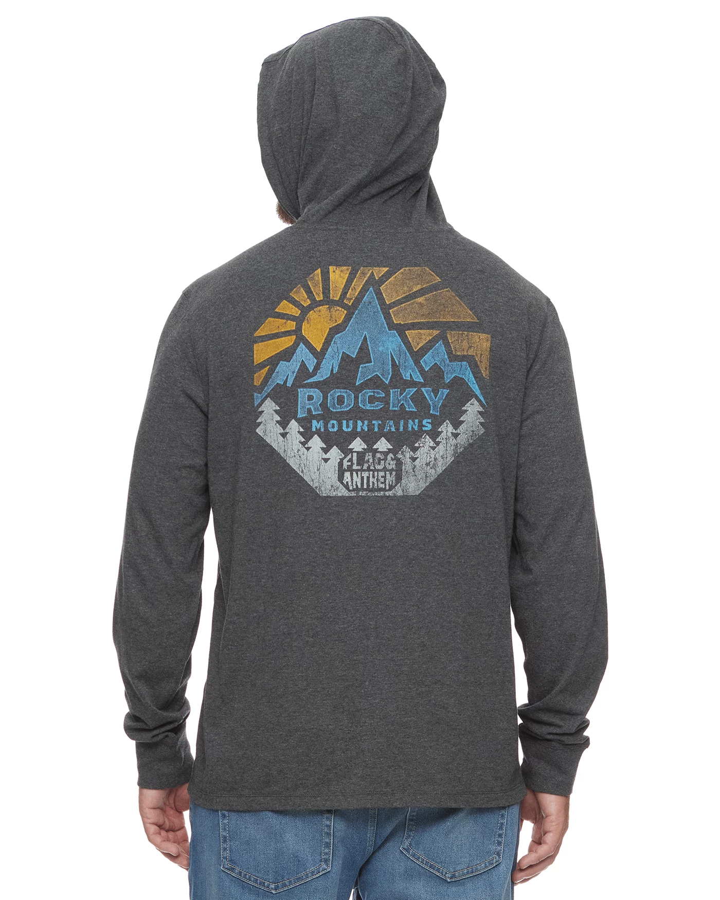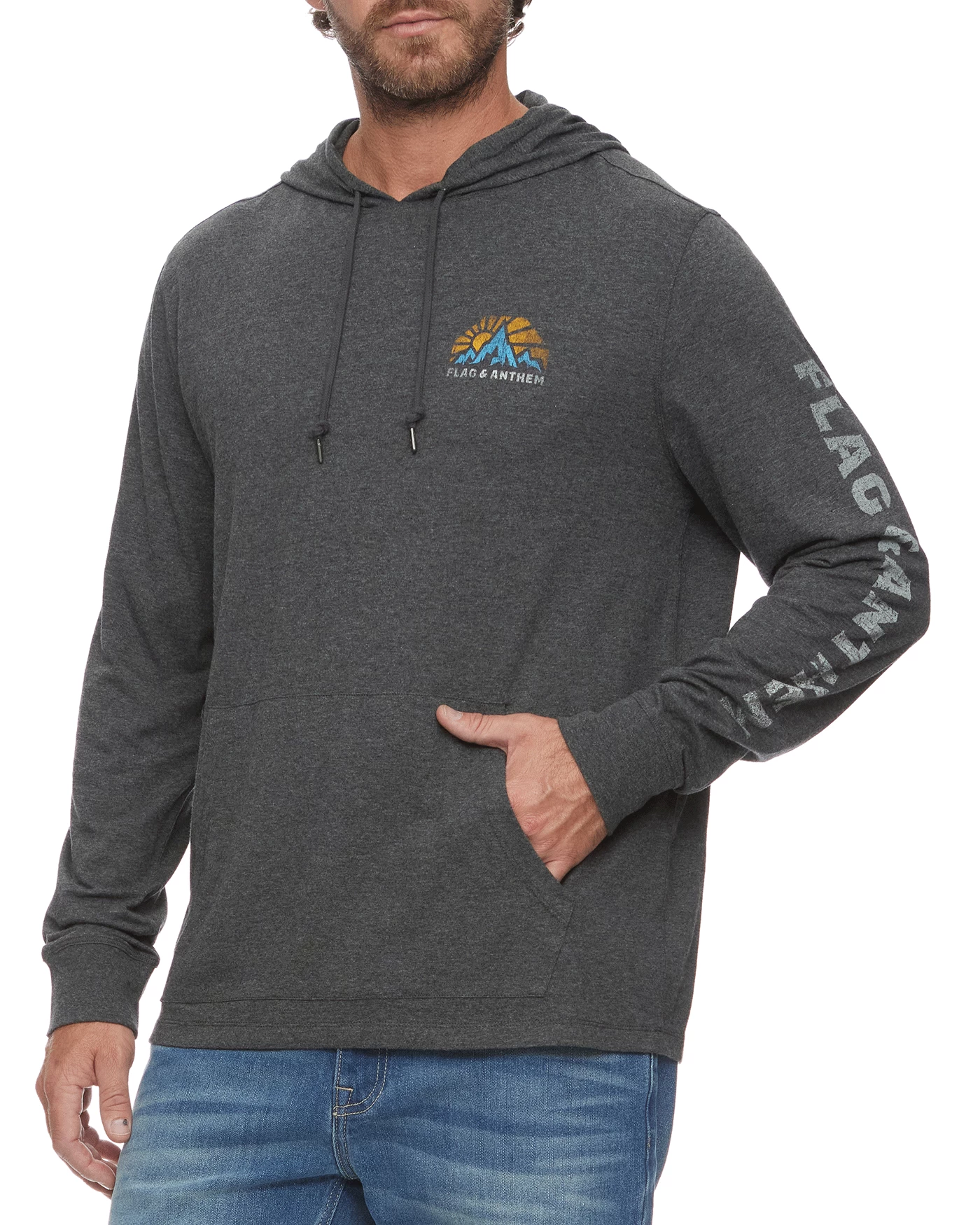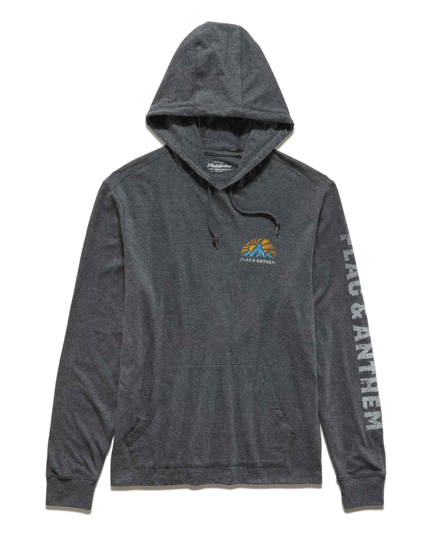 This lightweight jersey hoodie will likely be the most comfortable one you’ll own. Made from a special blend of super-soft fabrics, impeccably tailored for an always-perfect fit, it’s our go-to layer for cool summer nights, crisp fall mornings, and every moment in between. All-original Flag & Anthem graphic artwork on the wearer’s left chest and back. Contrast color fabric inside adjustable drawstring hood; functional kangaroo front pocket. Flag & Anthem wordmark logo along left sleeve. Tailored athletic fit.