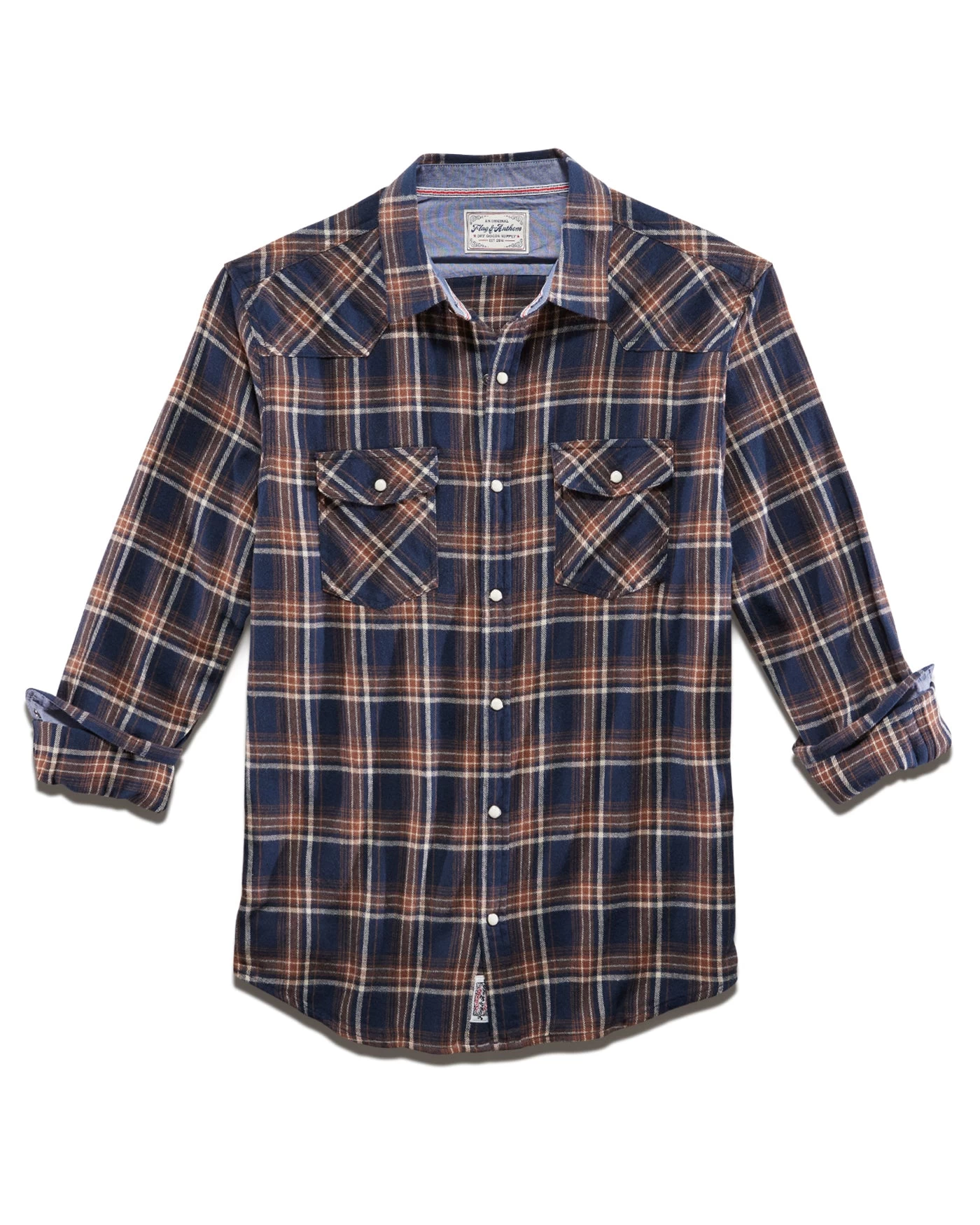 This rugged, dependable cotton flannel shirt is brushed on both sides for supreme softness, long-wearing comfort, and warmth. Contrast fabric inside collar stand, back yoke, front placket, and sleeve cuffs. Dual front flap pockets; pearlized snap closures. Tailored athletic fit.