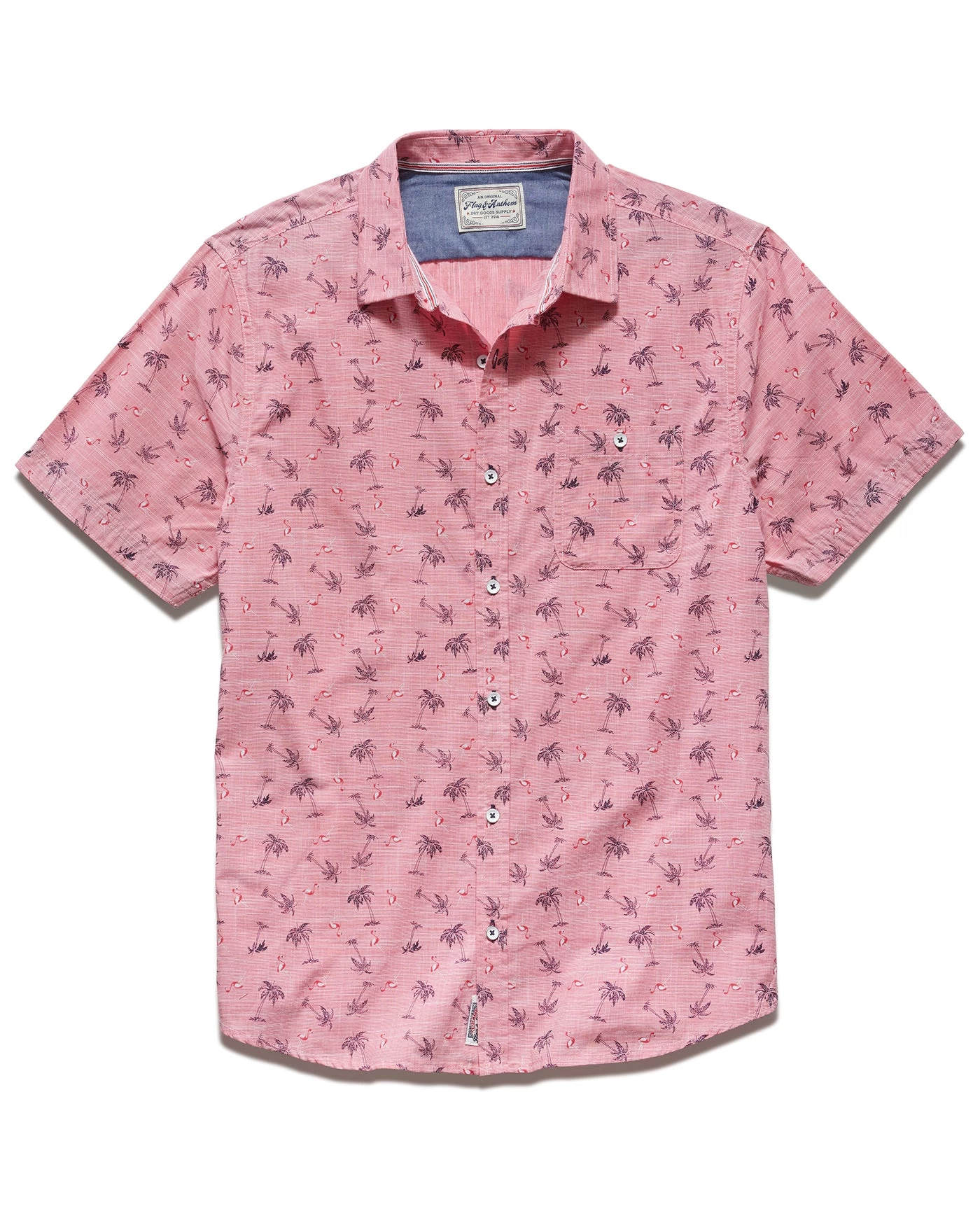 Featuring an all-over breezy mini palm tree and flamingo print, this comfortable and casual short sleeve shirt adds a tropical twist to your everyday look. Made from a breathable, lightweight cotton blend fabric in a tailored athletic fit, it’s comfortable, versatile, and easy to wear for any warm-weather event. Contrast chambray fabric in collar and cuffs. Single front chest pocket; button closures.