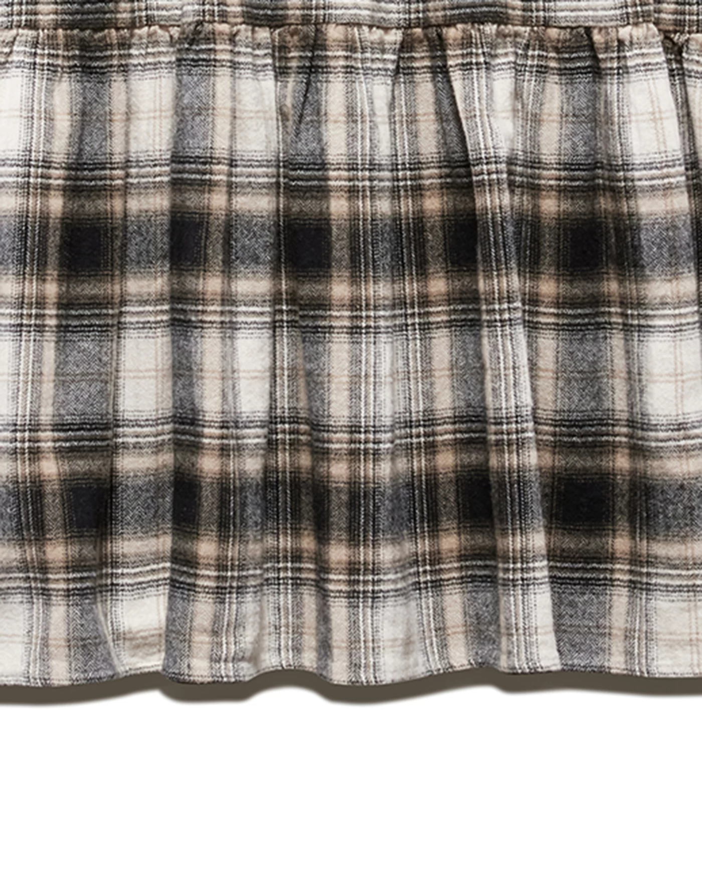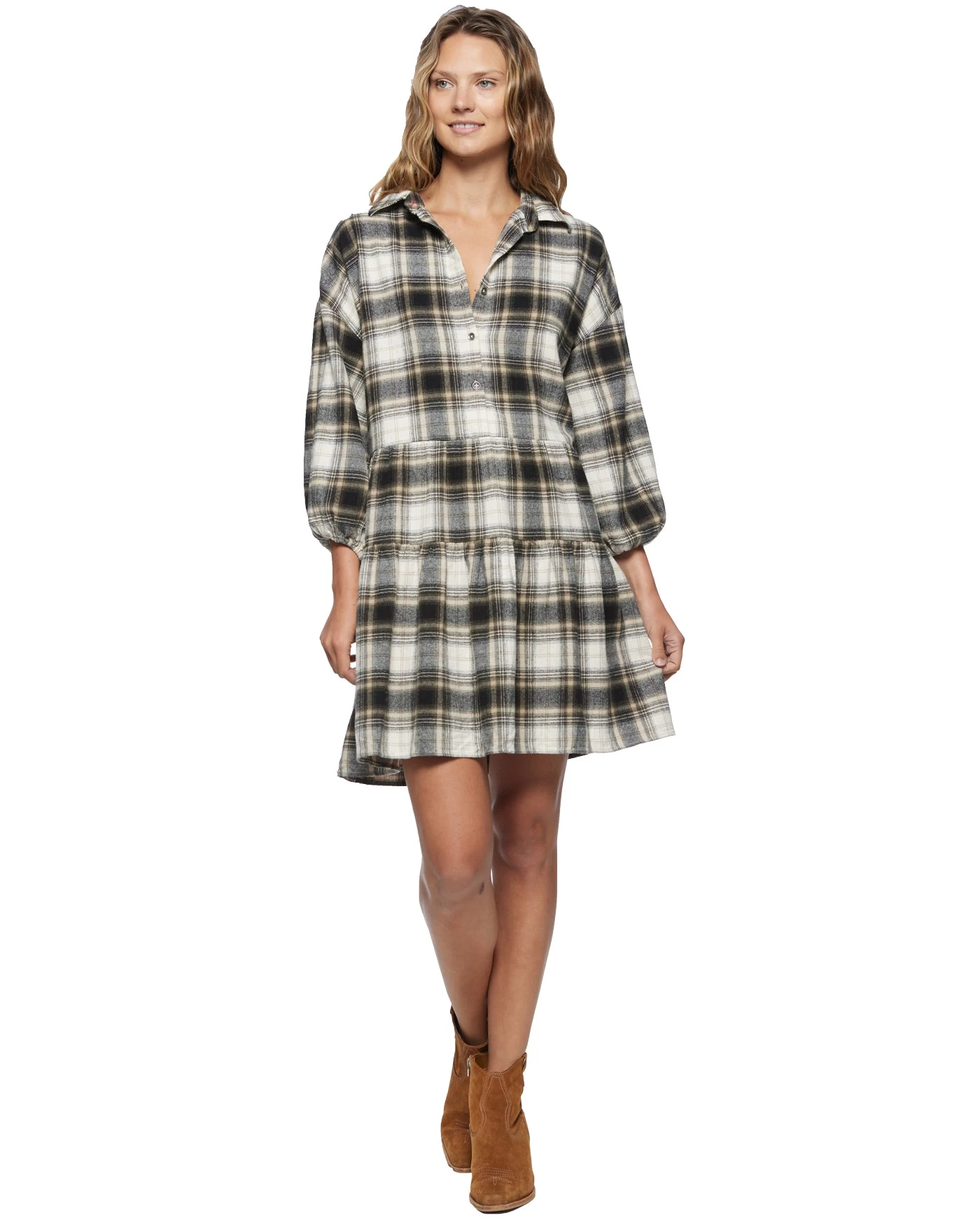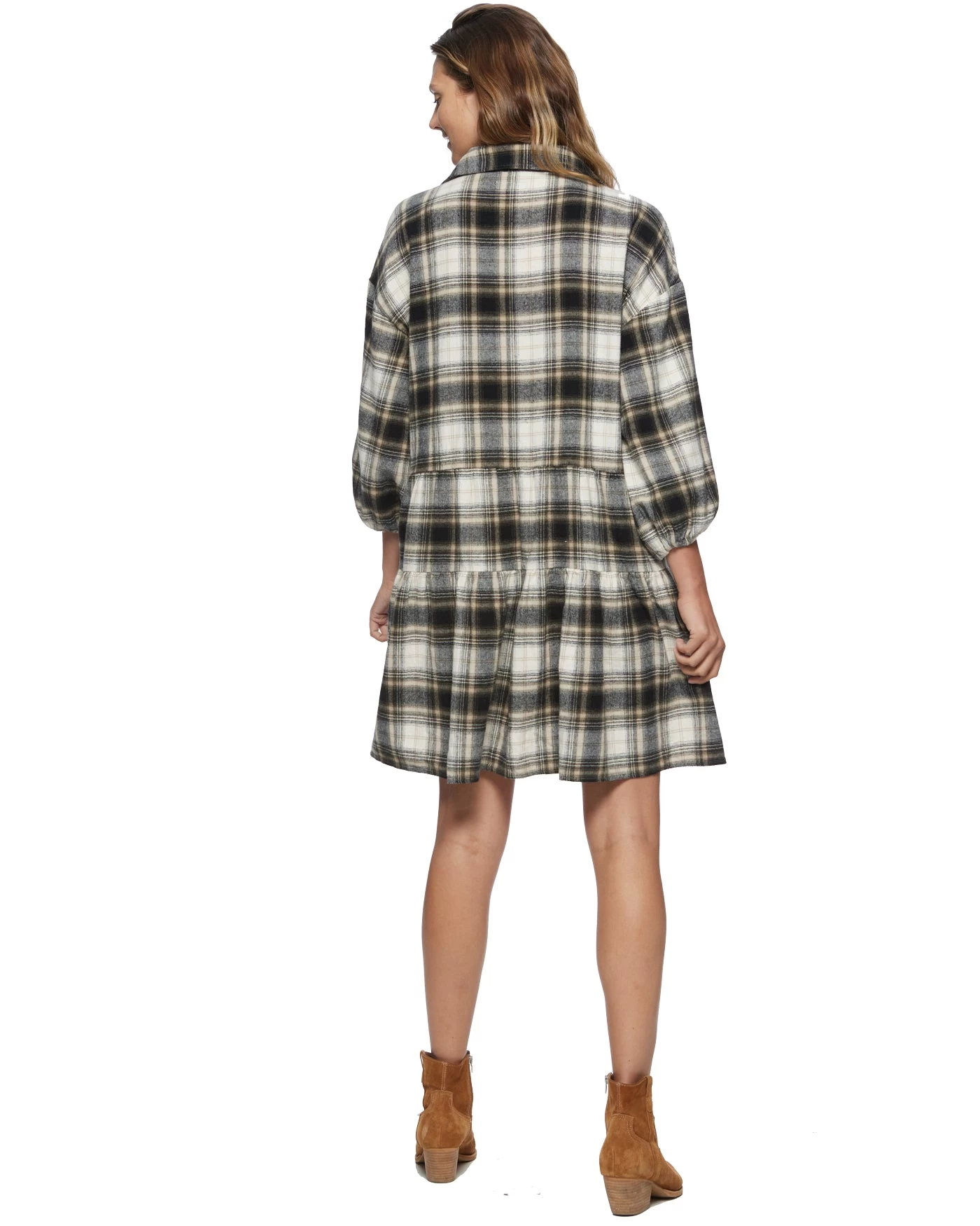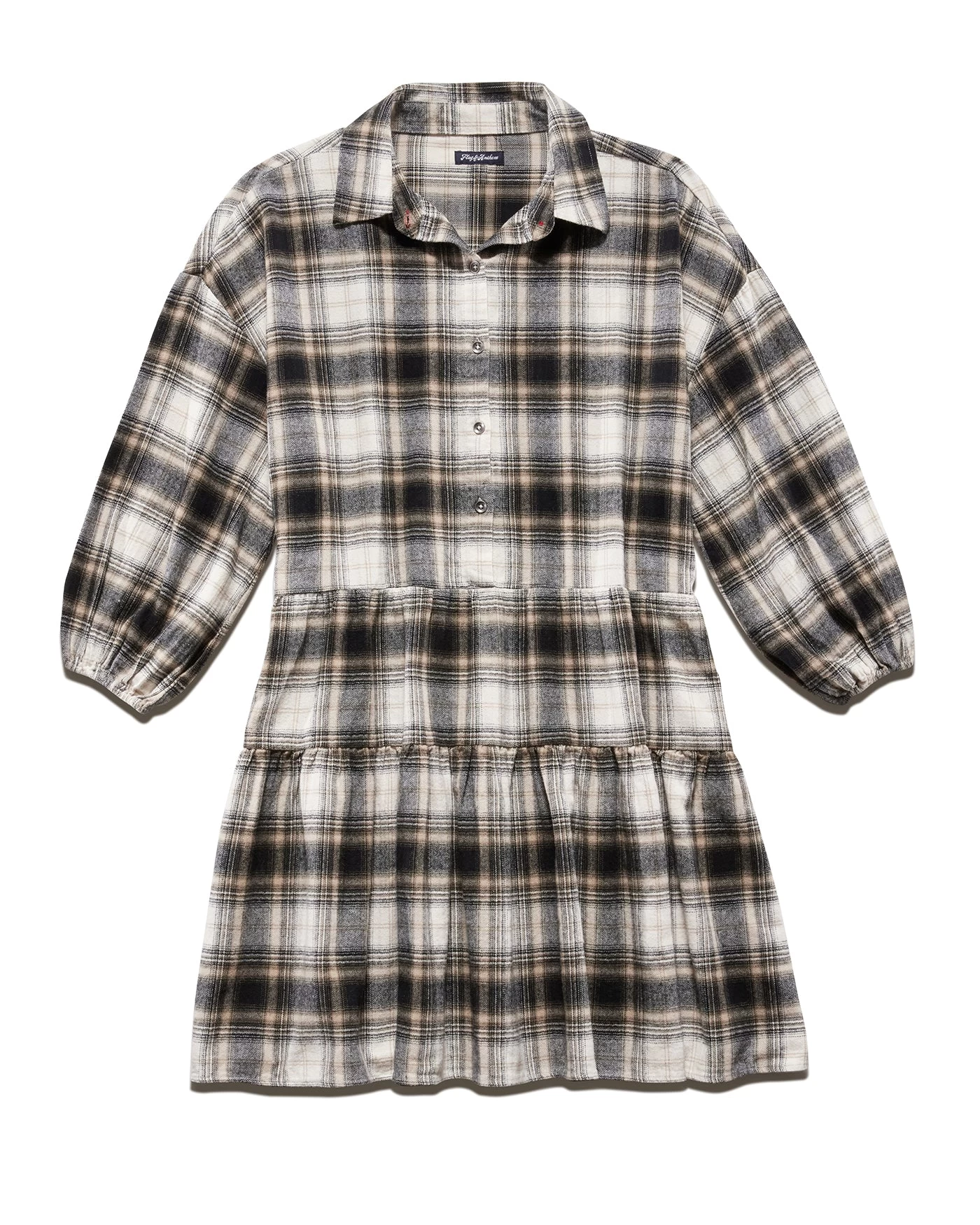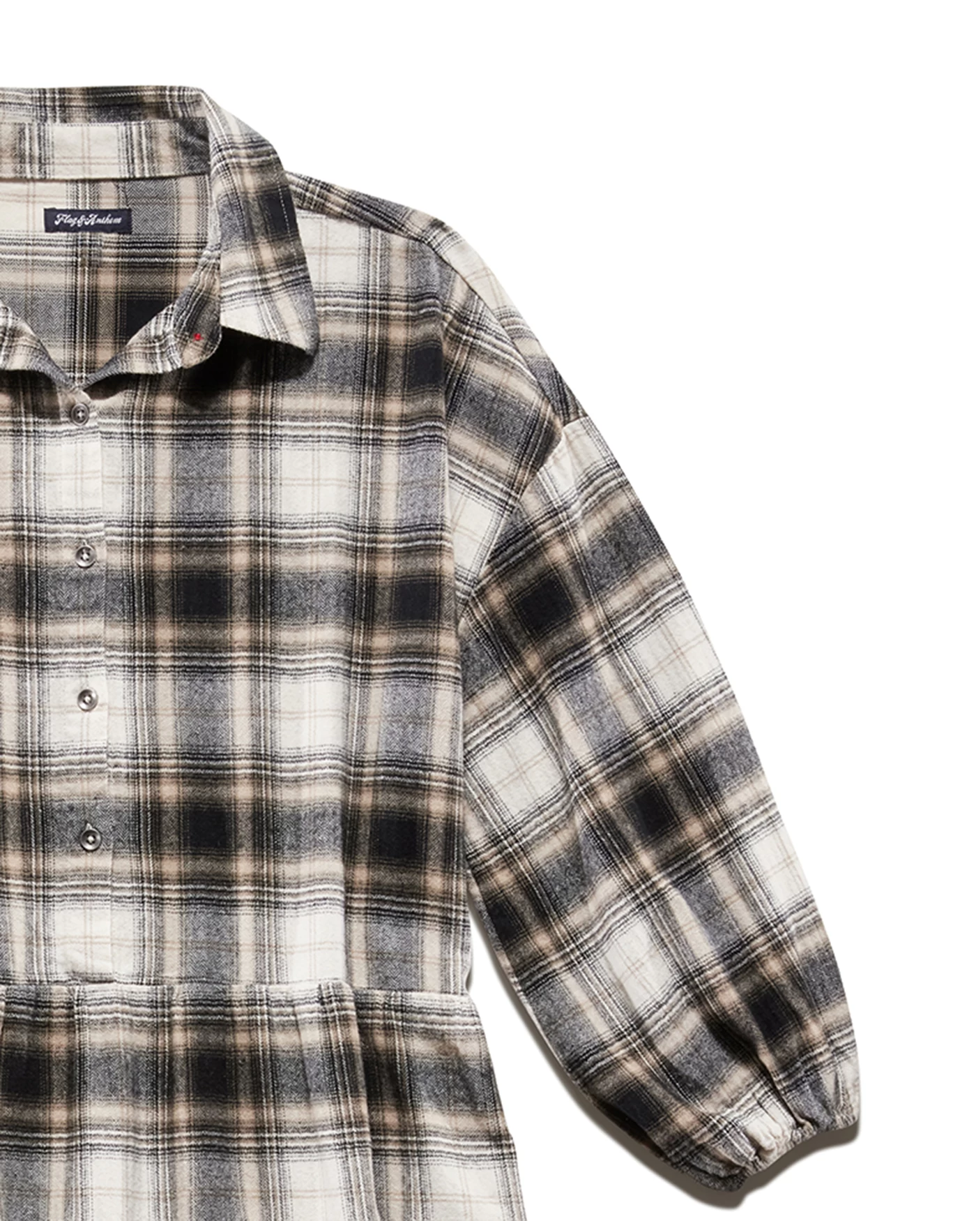 Give your casualwear a comfy update with this effortlessly flattering fall staple. Loosely tailored through the top and flowy through the skirt, this tiered silhouette combines everyday polish and versatile style. Point collar; button front. Long sleeves with puff shoulders and button cuffs. Contrast fabric inside neckband, back yoke, sleeve cuffs, and sleeve plackets. Oversized fit. We recommend sizing down for a more fitted look and feel.